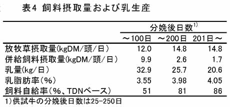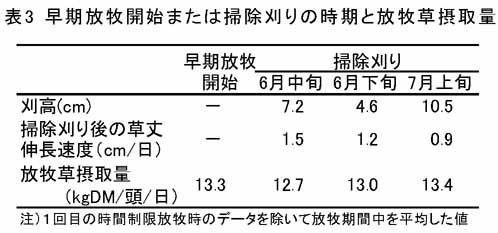 - MF放牧地では、草丈15-20cm程度で早期に放牧開始すると、掃除刈りせずに30cm以下の短草利用ができるが、草丈が伸びた場合は、7月上旬の掃除刈り(刈高高め)の実施が望ましい(表3)。また、草丈40cmまでは昼夜放牧で10-15kgDM/頭/日の放牧草を摂取する。MF草地とTY草地を組み合わせた放牧においても、飼料自給率約70%(TDNベース)で8000kg程度の乳生産が可能である(表4)。