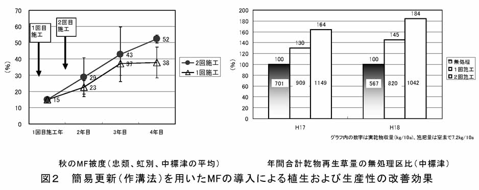 - MF「ハルサカエ」は地下茎型イネ科草(シバムギ・ケンタッキーブルーグラス)優占草地に、簡易更新(作溝法)による導入が可能で、1回目の施工後、翌年2回目の施工で4年目にはMF被度が50%以上の優占草地に植生改善することができる。年間合計乾物再生草量は地下茎型イネ科草優占放牧地比で30%〜80%程度の増加が期待できる(図2)。簡易更新の作業方法は「簡易更新マニュアル」を参考にすると良い(mailto:http://www.agri.pref.hokkaido.jp/konsen/labo/sakumotsu/kankoumanudl.htm)。