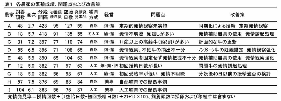 - 調査した繁殖経営9戸の管理と繁殖成績、問題点および改善策を表1に整理する。分娩間隔は363〜428日、初回授精日数は56〜95日、空胎日数は76〜127日、発情発見率は55〜87%である。初回授精日数および分娩間隔延長の要因は発情の見逃し、無発情、発情徴候不明瞭、高産次牛繋養、不妊牛摘出不十分などである。発情観察の強化、発情発見補助器具の使用、発情誘起処理、計画的な繁殖雌牛の更新、早期妊娠鑑定などが対策としてあげられる。