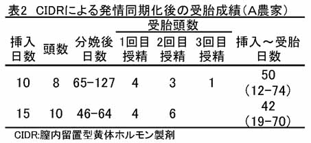 - 膣内留置型黄体ホルモン製剤(CIDR)による発情同期化を試みた農家の成績(表2)では、CIDR挿入(10または15日間)開始から74日目までに全頭(18頭)が受胎したことから、当処理は発情観察作業の省力化手段として有効である。