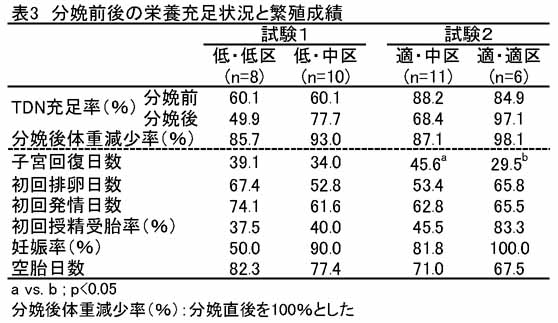 - 分娩前後のTDN充足率を低・低区(60・60%)、低・中区(60・80%)、適・中区(100・80%)、適・適区(100・100%)の4区を設定し、黒毛和種雌牛それぞれ8、10、11、6頭を供試し比較したところ、母牛の分娩後体重変化は栄養充足状況を反映し、分娩後体重をほぼ維持していたのは適・適区のみである。また、初回発情日数は低・低区で74日と最も長く、他の3区では62〜66日と差がない。人工授精は分娩後20〜112日で行ったが、妊娠率は低・低区のみが50%と低く、初回授精受胎率はTDN充足率が高いほど良好な傾向がみられ、適・適区で83%と最も高い(表3)。