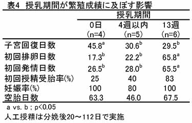 0日と4週以内ではともに初回排卵日数は約20日、初回発情日数も28日以下となり、13週の66、66日に比べて大幅に短縮する(表4)。これらは、子牛による吸乳刺激が無いためである。