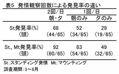 - 発情観察回数を1日2回(朝:8時頃、夕:18時頃)と1回(朝または夕)で比較すると1日2回で92%、朝のみで83%、夕のみで49%で、夕方のみの観察では大幅に発見率が低下する(表5)。