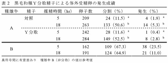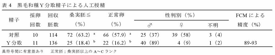 - 黒毛和種(種雄牛A)Y分取精子を用いた人工授精は、発生率および正常卵率のいずれも対照に比較して低い(表4)。Y分取精子による受精卵の雄の割合は対照に比較して高く、FCMで再分取して評価した精度と一致する(表4)。受精卵移植により生産した子牛3例は、難産(双子)による死亡、生後直死および正常子牛が各1例であり、いずれも外貌、生時体重等に異常はみられない。生存した1例の体高および体重は黒毛和種の発育標準の範囲内である。