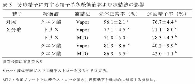 - クエン酸緩衝液で希釈した精子(ホルスタイン種)はトリス緩衝液で希釈した精子に比較して先体正常率および運動精子率のいずれも高い値を示す(表3)。また、クエン酸緩衝液で希釈し、MTG法で凍結することで最も高い先体正常率および運動精子率が得られる。