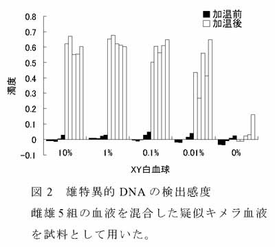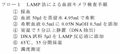 - 血液は、NaOHによる簡易DNA抽出後に試料として用いることができ、10〜0.01%のXY白血球を含むすべての血液で雄特異的DNAを検出できる(図2)。判定に要する時間は血液の処理を含め約1時間であり、従来の染色体検査(3-4日)あるいはPCR法(4-5時間)に比較して短縮できる(フロー1)。