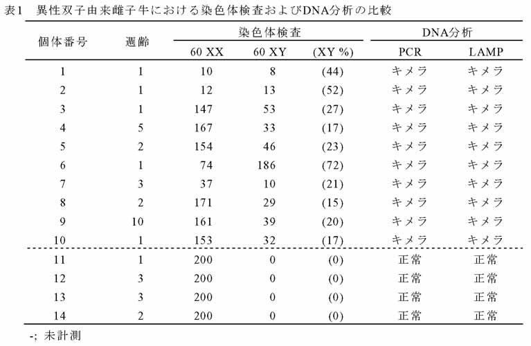 - 異性双子由来の雌子牛から採取した血液のLAMP法によるキメラ検査結果は、すべて染色体検査およびPCR検査の結果と一致する(表1)。LAMP法で正常と判定された4例は発情行動を示し、3例はこれまでに受胎あるいは分娩したことから正常な繁殖能力を持つと考えられる。