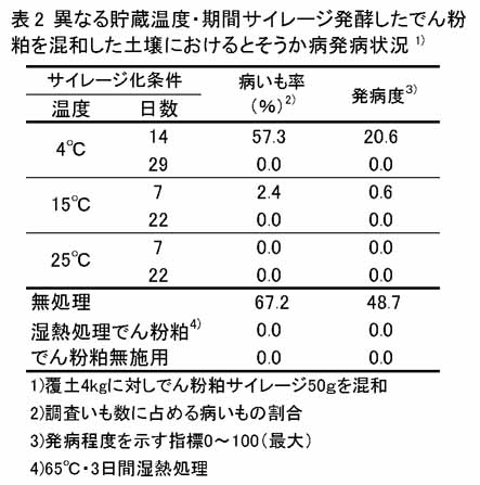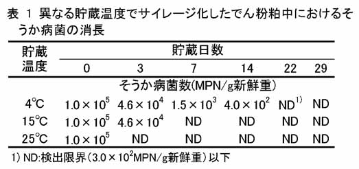 - でん粉粕中のそうか病菌はサイレージ発酵過程で死滅する。そうか病菌は貯蔵温度が高いほど短期間で検出限界以下となり(表1)、4℃・29日間、15℃・22日間または25℃・7日間発酵させたでん粉粕サイレージを土壌に混合してばれいしょを栽培してもそうか病の発病はみられない(表2)。