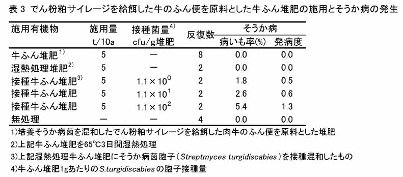- そうか病菌を接種した飼料、またはそうか病罹病いも由来のでん粉粕を給与した牛のふん便からそうか病菌は検出されない。このふん便を堆肥化後、土壌に施用してばれいしょを栽培しても、そうか病の発病は認められない(表3)。
