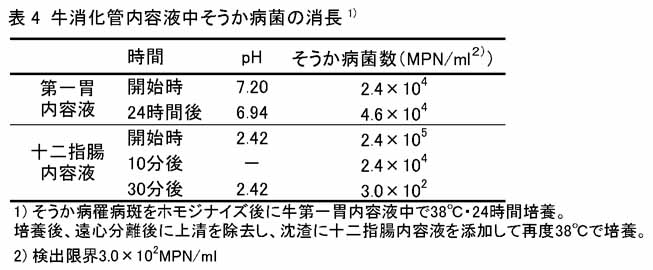 - 第一胃内容液(pH6〜7)中ではそうか病菌に顕著な菌数変化は見られないが、十二指腸内容液(pH2.4)中では指数関数的に減少する(表4)。