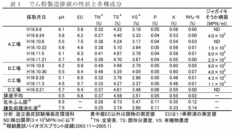 - 道内のでん粉製造工場から排出されるでん粉製造排液の固形分濃度(TS)は4〜5%、有機物濃度(VS)は3〜4%である(表1)。アンモニア態窒素(NH4-N)濃度は微量であるが、全窒素(TN)濃度はばらつきがあり、平均で0.37%と、乳牛ふん尿スラリーのTN濃度0.26%に比べ窒素濃度が高い。排液中のジャガイモそうか病菌数は検出限界菌数以下から、4.3×103MPN/mlまで幅が認められる。