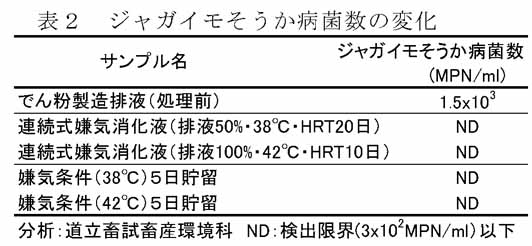 - 塊茎褐色輪紋病の病原であるジャガイモモップトップウイルスを媒介するジャガイモ粉状そうか病菌のでん粉製造排液中における存否、およびその処理過程における消長は未解明である。従って、でん粉製造排液を原料に使用した嫌気発酵処理液は草地に散布し、当面畑地での利用を避ける。