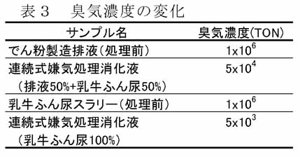 - 嫌気発酵処理によりでん粉製造排液中に含まれるジャガイモそうか病菌数は検出限界以下に減少する(表2)。また、嫌気発酵処理によってNH4濃度は上昇するものの、でん粉製造排液の臭気濃度は未処理排液の1/20に低減される(表3)。