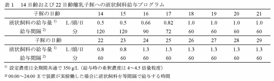 - 14日齢で離乳した子豚では、液状飼料の希釈濃度を6倍量程度とするより4倍量程度として給与液量を低減する方が、液状飼料給与開始時からの残食が少なく採食行動が活発となる。また液状飼料の摂取量が14日齢から19日齢まで直線的に増加した場合(最大摂取量1.0kg/頭/日)、14〜21日齢での日増体量は313±102g/日となる。この結果をもとに作成した、希釈濃度を4倍量程度とした14日齢離乳子豚への給与プログラムは表1である。