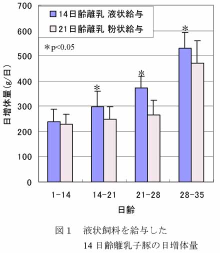 - 14日齢で離乳して14日間液状飼料を給与した子豚は、21日齢で離乳して粉状飼料を給与した子豚に比べて14〜35日齢の日増体量が有意に高く、また離乳後の発育停滞も認められない(図1)。その結果として、21日齢で離乳した子豚よりも30kgに到達した日齢が約4日、肥育が終了(105kg到達)した日齢が約10日短くなる。