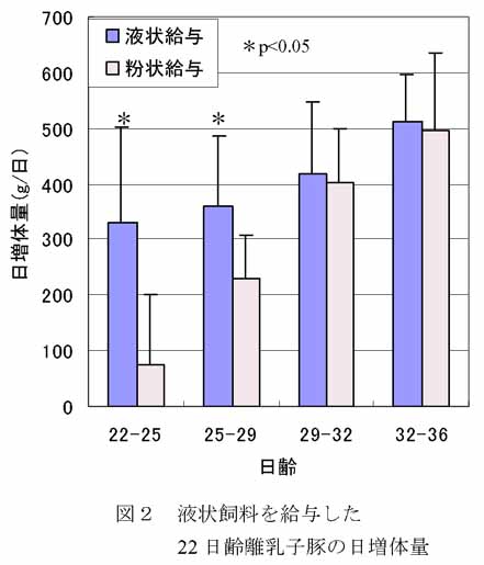 - 22日齢で離乳し液状飼料を給与した子豚は、同時期に離乳して粉状飼料を給与した子豚に比べて、離乳後1週間の日増体量が有意に高く(図2)、また離乳後の発育停滞も認められない。21日齢程度で離乳した子豚への液状飼料の給与方法は、14日齢離乳子豚への給与プログラムを変更することで対応が可能である(表1)。