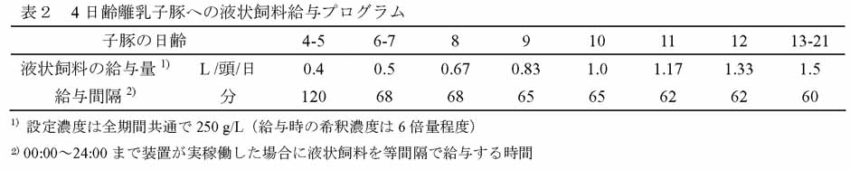 - 本試験で用いた装置には1回に給与する液状飼料の最低量が設けられており、本試験結果で作成した給与プログラムを適用するには、4日齢では15頭以上、14日齢および21日齢では11頭以上を1群とするように留意する。また飼槽の頭口数は1群の頭数以上とする。
