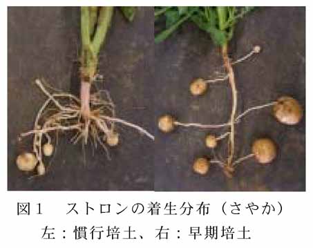 ジャガイモ、バレイショ、早期培土、慣行培土、塊茎分布、ストロン |