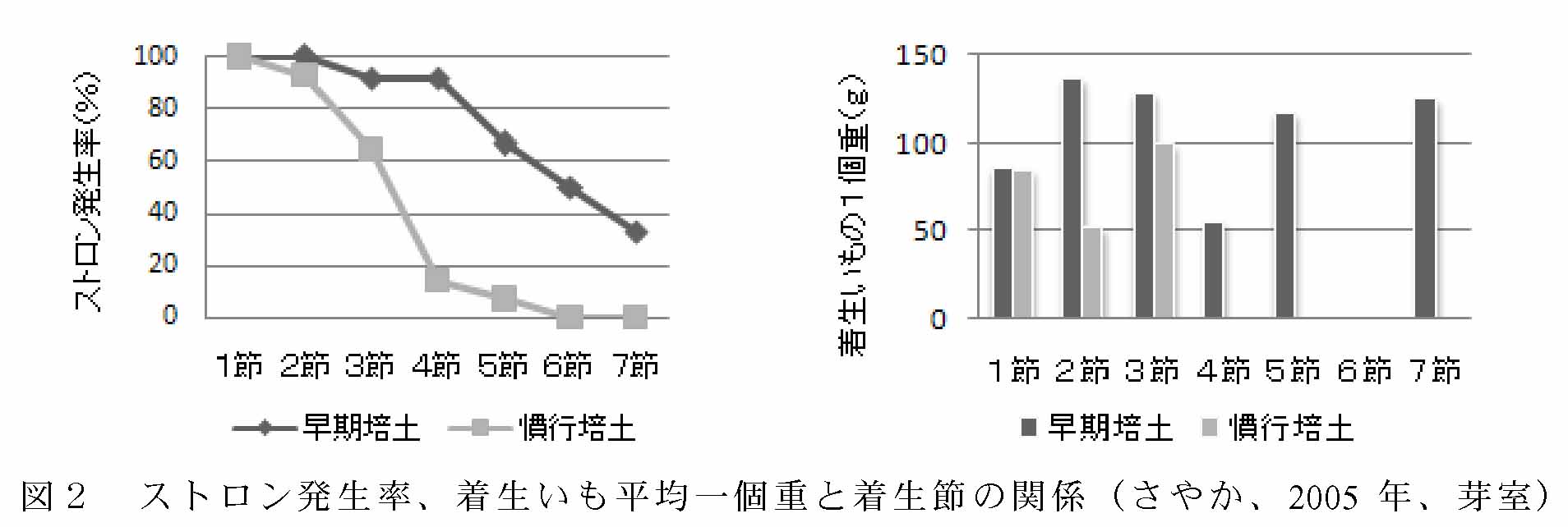 - ストロンの発生する節は種いもから地上に向かって配置し、慣行培土では4節でストロンの発生がほとんど見られなくなる。これに対し早期培土ではより高位の節までストロンが発生し、高位の節まで塊茎が肥大する(図2)。