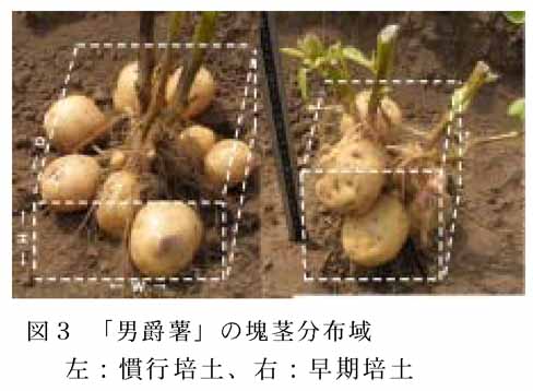 - 培土内での塊茎分布は、慣行培土では平面に分布するのに対し、早期培土では縦に広がり立体的に分布するが、体積には有意な差を認めない(表1、図3)。