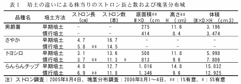 - ストロン長の平均は、早期培土が慣行培土に比べ有意に短い。しかしストロンの数は、両培土法で顕著な差はない(表1)。