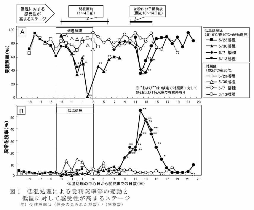 - 個々の花で見た場合、「花粉四分子期前後」(開花10〜14日前)と「開花直前」(開花1〜4日前)の2つのステージで低温感受性が高まり、受精莢率の低下が観察される(図1A)。また、花粉四分子期前後の低温によって、形態が異常な花粉粒が発生した(図1B)。