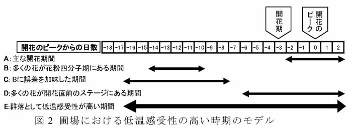 - 群落で見た場合、開花のピークの約16日前から「花粉四分子期前後」の低温感受性期間が始まり、引き続き「開花直前」の低温感受性期間が存在する(図2)。
