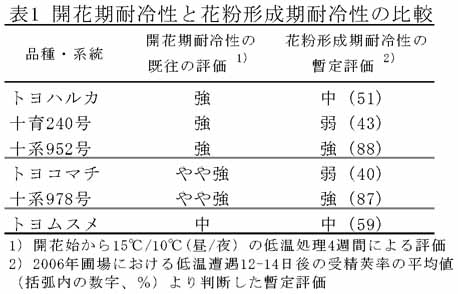 - 花粉形成期耐冷性に品種間差があり開花期耐冷性の評価とは必ずしも一致しない(表1)。