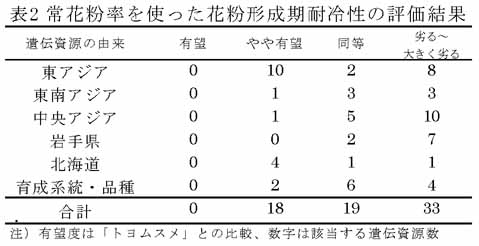 - 国内外の多様な遺伝資源70点の中には花粉形成期耐冷性の品種・系統間差があり、北海道以外の遺伝資源の中にも北海道の耐冷性品種並のものも存在する(表2)。