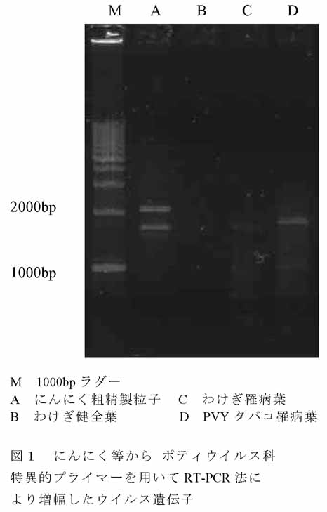 - ウイルス症状のわけぎ、にんにくからポティウイルス科特異的プライマーを用いてRT-PCRを行うと約1600〜2000bpの増幅産物が得られる(図1参照)。