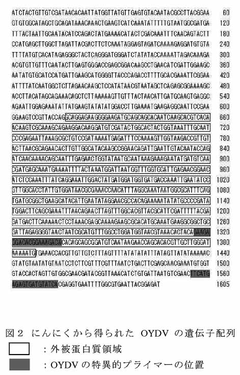 - この遺伝子配列を解析すると、わけぎの増幅産物はネギ萎縮ウイルス(SYSV)、にんにくの2つの増幅産物はリーキイエローストライプウイルス(LYSV)とタマネギ萎縮ウイルス(OYDV)の既知の外被蛋白質遺伝子と、アミノ酸配列相同性が99〜100%と高い。