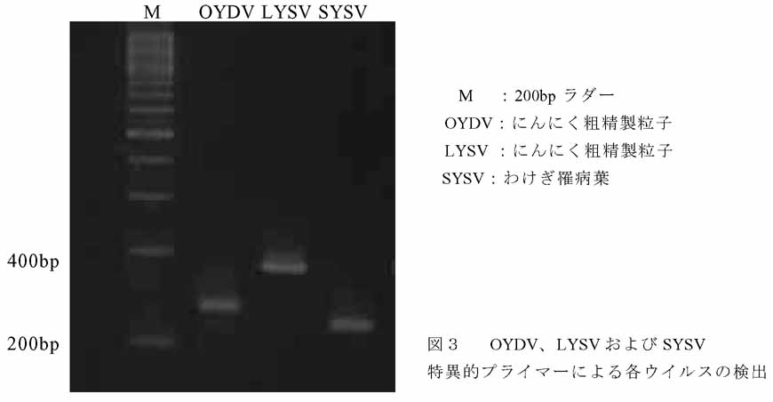 - 解析した遺伝子配列を基にSYSV、LYSV、OYDVそれぞれの特異的プライマーを設計し、RT-PCR法によるウイルス検出を試みると、250〜350bpのそれぞれ一本の明瞭な増幅断片が得られ、各ウイルスを特異的に検出できる(図2、図3)。