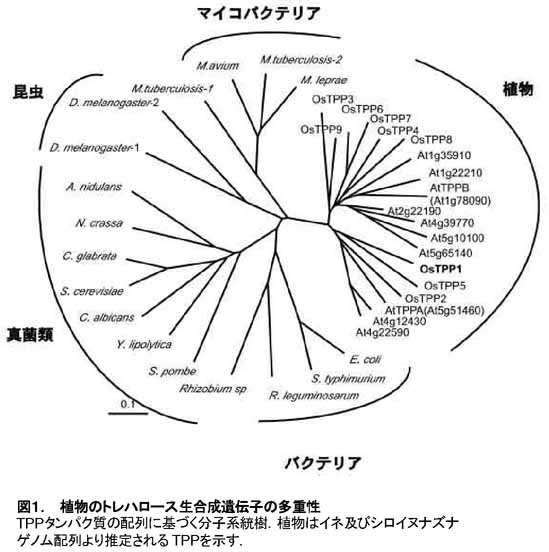 - 微生物や動物ゲノム中のトレハロース生合成遺伝子は1-2コピーであるが、植物ゲノムでは10コピー前後と多重化しており(図1)、各遺伝子が複雑な制御を受けると推測される。