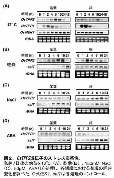 - 単離されたOsTPP2遺伝子は、酵素活性をもつTPPをコードし、低温、乾燥、アブシジン酸により一過的に誘導されるが、その蓄積パターンはOsTPP1と異なる(図2)。