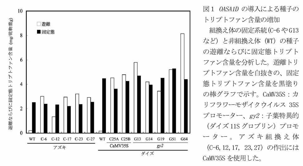 イネ改変型アントラニル酸合成酵素αサブユニットを発現したダイズとアズキでは遊離トリプトファン含量が著しく増加し、全トリプトファン含量は非組換え体の約2倍に増加する。 |
