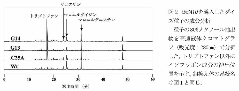 - 組換え体はトリプトファン類似物質である5-メチルトリプトファンによるフィードバック阻害を受けないことから、OASA1Dはダイズやアズキの組換え体の選抜マーカーとして使用できる可能性がある。