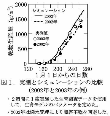 - 水稲の潜在生産力(乾物生産量、冷害年については深水管理により障害不稔を回避した場合の値)を、シミュレーションで再現できる(図1)。