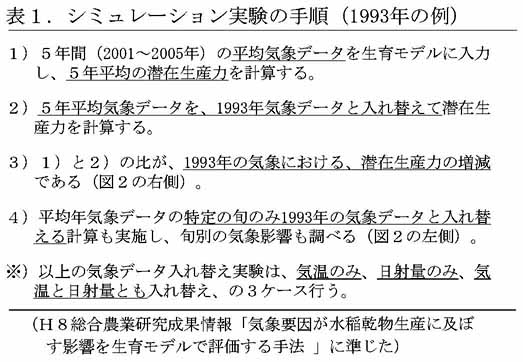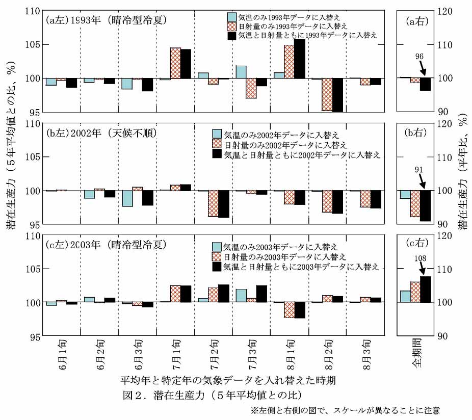 - 1993年の気象データで計算した潜在生産力の、5年平均値に対する比は96で(図2a右)、北海道の作況指数(40)を大きく上回る。2003年(作況指数73)も同様である(図2c右)。このように、オホーツク海高気圧型冷夏では潜在生産力は低下しない。旬別に見ると(図2a左、c左)、低温による潜在生産力低下はほとんど認められず、一方、日射量の多少が潜在生産力に強く影響している。