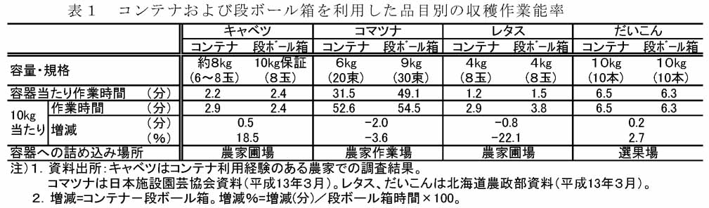 通いコンテナの利用では、収穫作業能率への影響は品目ごとの特性によって異なり、容器代は段ボール箱並になりつつある。産地が通いコンテナを利用して有利販売を達成するには、コンテナの利用が出荷先にもメリットをもたらす提案が必要である。 |