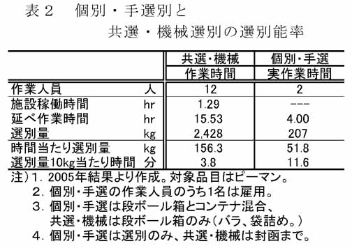 - コンテナの利用により、レタスやコマツナのように収穫〜収納作業能率が向上する品目と、キャベツやだいこんのように低下する品目が見られる(表1)。これは、品目ごとの性状(大きさ、伸縮性、傷つきやすさなど)に応じて、作業の難易度が異なることが作業能率に影響を及ぼしているためと推察される。また、機械共選システムでは搬送コンベアの幅とコンテナの幅が合わない等のためコンテナは利用できない。このため、機械共選を導入している産地では別途手選別ラインが必要となるが、その能率は機械共選と比べて大幅に低下する。(表2)