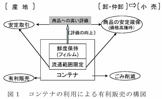 - 産地Aがコンテナ利用を有利販売に結びつけることができたのは、@現状ではコンテナは契約先以外へは流通できないため、コンテナを利用することで商品の確保に関して出荷先から信頼を得やすいこと、A出荷先の評価が高いつまり出荷先は価格高騰時でもその商品を確保したいとする要望が強いこと、Bコンテナと鮮度保持資材で鮮度保持と店舗での店持ちを長期化できることを提案したこと、による(図1)。
