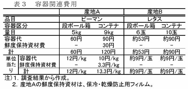 - コンテナのレンタル料金は低下傾向にあり、単位当たりの容器代そのものは、産地Aでは段ボール箱より安く、産地Bでは同等である。産地Aでは、鮮度保持フィルムを含めても、段ボール箱とほぼ同等である。(表3)