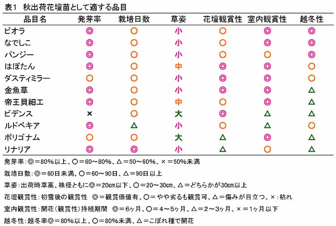 - 栽培適性が高い品目はマリーゴールド、リナリア、金魚草、パンジー、ビオラである。観賞適性が高い品目はビオラ、なでしこ、パンジー、はぼたん、ダスティミラー、帝王貝細工である。栽培適性、観賞適性ともに高く、有望と思われたのは、ダスティミラー、ビオラ、なでしこ、パンジー、金魚草、帝王貝細工、はぼたんの7品目である(表1)。