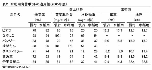 - 供試品目は全て水稲育苗用ポットで稚苗育成が可能であり、導入にかかるコストを軽減できる(表2)。