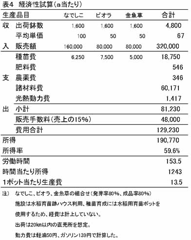 - なでしこ、ビオラ、金魚草の3品目を当分に生産した場合、労働時間は1a当たり153時間程度と考えられ、7月上中旬に作業ピークがある。生産コストは1ポット当たり約13円になると試算され、直売所への出荷を想定したモデルケースでは1aで19万円程度の所得が見込めると考えられる(表4)。試験販売では売れ行きは概ね好調で、なでしこ等越冬性のある品目の人気が高かった。アンケート調査では秋花壇苗の条件として「冬越しするなら」をあげた人が最も多かったが、「冬越ししなくてもきれいなら」をあげた人も半数以上いた。