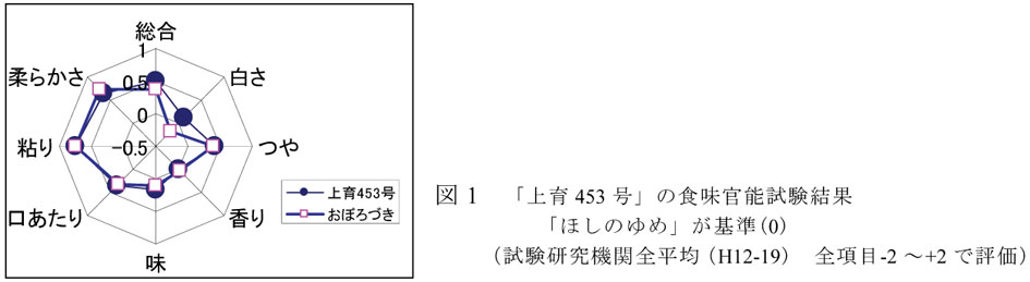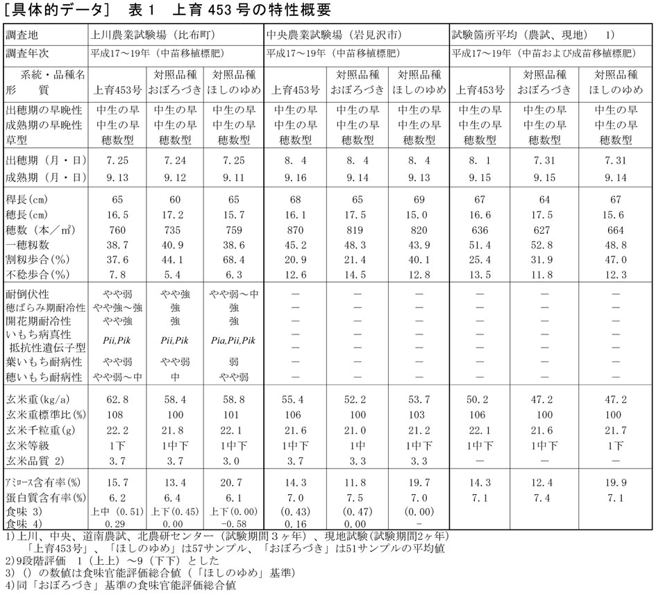 「上育453号」は出穂期が“中生の早”であり収量性が高く、アミロース含有率が適度に低いため食味が「ほしのゆめ」に明らかに優り「おぼろづき」並かやや優り良好である。