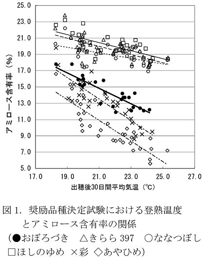 - 農試(北海道立中央・上川・道南農試、北海道農業研究センター)の奨励品種決定圃場およびそれに準じる圃場の気象データから得られた回帰式はy=-0.9447X+34.669、R2=0.7495(X=出穂後30日間平均気温、Y=アミロース含有率)であり、アミロース含有率は出穂後30日間の平均気温が1℃上昇すると約1%低下する(図1)。