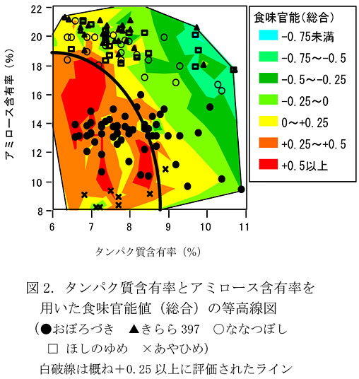 - 食味官能試験より「おぼろづき」の食味は、タンパク質含有率8%未満、アミロース含有率12%以上、16%未満で、基準となる「ほしのゆめ」(4カ年平均,タンパク質含有率7.2%、アミロース含有率20.2%)より明らかに優る(図2)。