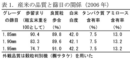 - グレーダーの篩目の拡大により精玄米の歩留まりが著しく低下する。篩目1.85mm〜1.95mmの白米白度、タンパク質含有率、アミロース含有率についての影響は小さい(表1)。