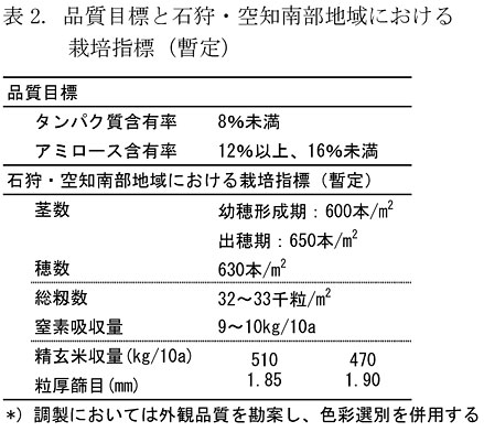 - 石狩・空知南部地域における「おぼろづき」の栽培において、倒伏が無く、タンパク質含有率8%未満を達成できる条件として、総籾数32千粒/m2〜33千粒/m2、窒素吸収量9〜10kg/10a程度、精玄米収量470kg/10a(篩目1.90mm)、精玄米収量510kg/10a(篩目1.85mm)を暫定的な指標として提案する(表2)。
